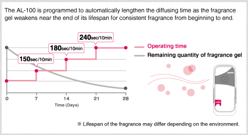Air freshener diffuser programmed to release consistent fragrance from beginning to end.